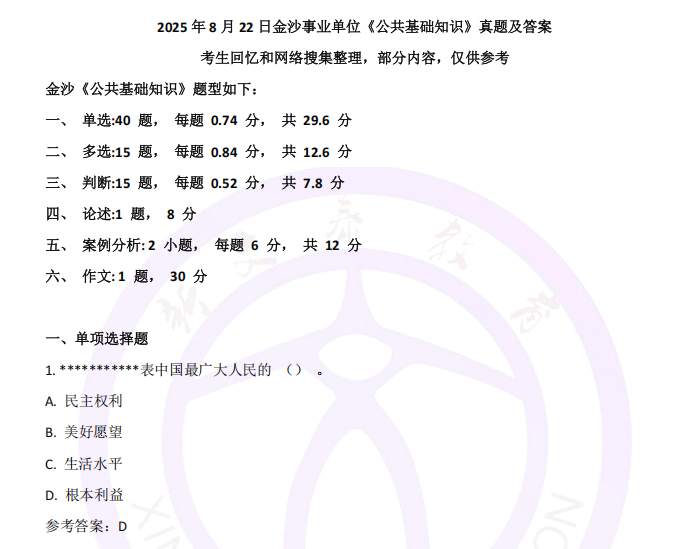 关键字:2025年,金沙事业单位,公共基础知识,真题及答案