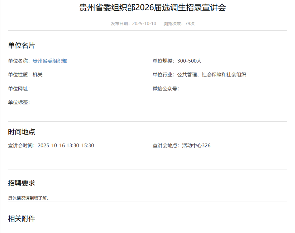 贵州2026年定向选调生招录公告即将启动,贵州省委组织部 2026 届选调生招录宣讲会将于2025年10月16日13:30-15:30展开。