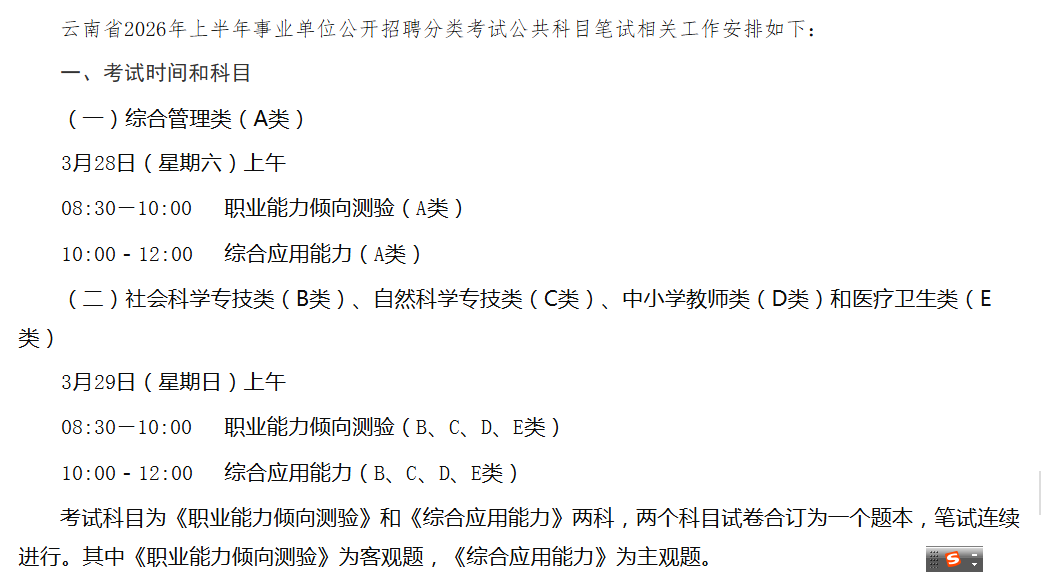 原标题:云南省2026年上半年事业单位公开招聘分类考试公共科目笔试相关工作安排