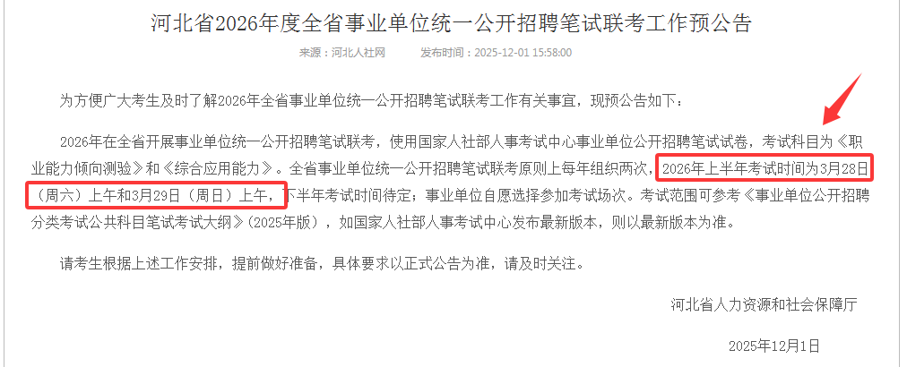 原标题:河北省2026年度全省事业单位统一公开招聘笔试联考工作预公告