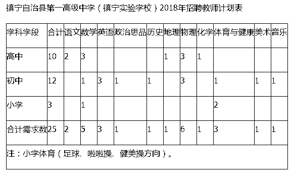 镇宁自治县第一高级中学(镇宁实验学校)2018年公开招聘教师简章 镇宁布依族苗族自治县第一高级中学(镇宁实验学校)是由镇宁县人民政府、北京师范大学、贵州励耘教育置业投资管理有限公司按照“混合体制、资源服务、协议管理”的原则,合作创办的一所体制创新型学校。结合我校发展要求,根据市委、市政府《关于进一步实施科教兴安战略大力加强人才队伍建设的意见》(安市发〔2012〕23号)和《关于加强人才培养引进加快科技创新的实施意见》(安市发〔2013〕14号)精神,经镇宁自治县人民政府2018年第四次常务委员会研究,同意公开招聘小学、初中、高中教师共25名。