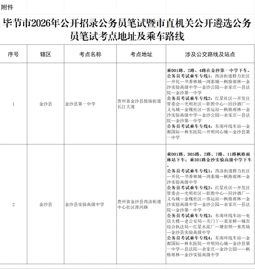 五、我市分别在七星关区、大方县、黔西市、金沙县、织金县、纳雍县、威宁县和赫章县设置考点,由于本次笔试的考点较多,分布较广,建议您提前了解乘车路线查看考点地址(附后),考试当天务必提前出发前往考点,尤其要把堵车因素和入场时间考虑在内。如果您是外地考生,建议您尽量在考点附近住宿。