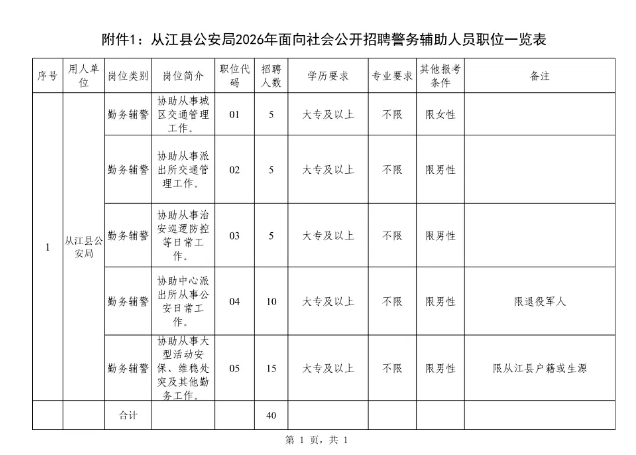 根据工作需要,从江县公安局2026年面向社会公开招聘警务辅助人员。现将有关事项公告如下: