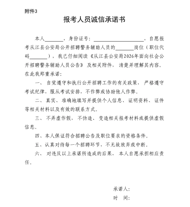 (1)报名时报考者根据所报职位,按要求填写《从江县公安局2026年公开招聘警务辅助人员报名信息表》(以下简称《报名表》)和《报考人员诚信承诺书》。