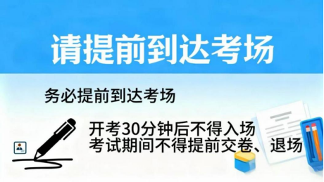 在考试开始前30分钟,凭准考证和身份证进入考场,对号入座,并将准考证、身份证放在桌面上。开始考试30分钟后,不得入场;考试期间,不得提前交卷、退场。