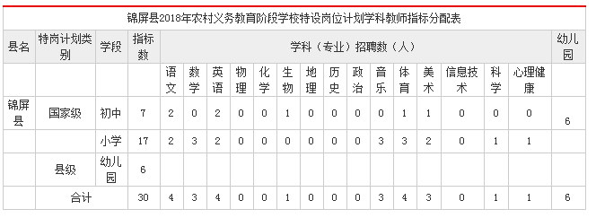 详见“锦屏县2018年农村义务教育阶段学校特设岗位计划学科教师指标分配表”(附表1)。