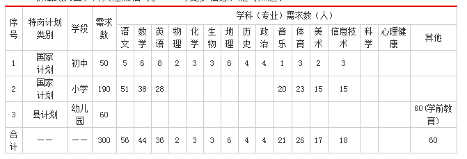 2018年全县国家“特岗计划”指标240名(小学190名、初中50名)、县“特岗计划”指标60名,具体指标分配详见附表。