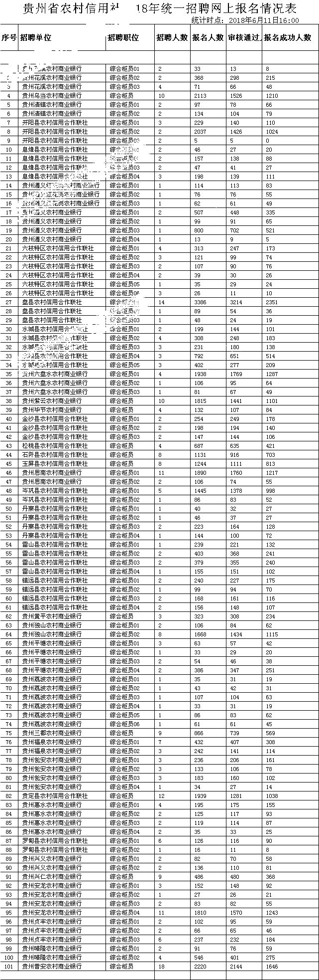 2018年贵州农信社招聘324人报名已经结束,报名首日至6月11日16:00,报名人数共有40571人,其中通过审核的有34669人,成功报名人数为25788人。此次报名时间为6月7日上午9:00至6月11日下午5:00。现将各个地市的报名人数统计如下。