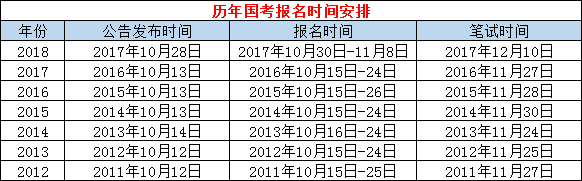 从图中可以看出,国家公务员考试报名时间相对稳定,国家公务员考试公告会在报名前两三天发布,考生可充分利用这段时间仔细查阅公告和报考指南,以确定自己可以报考哪些岗位。国家公务员考试笔试时间主要集中在11月最后一个周末或12月第一个周末。希望各位考生安排好自己的时间,争取考试成功!