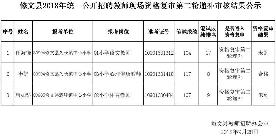 修文县2018年统一公开招聘教师现场资格复审第二轮递补审核结果公示