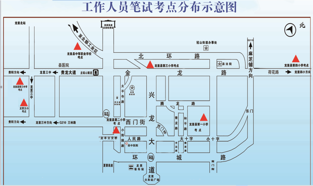 四、请考生注意乘车安全,因各考点周边无充足停车位,请自驾车的考生提前做好相关准备,为方便考生了解考点布局,我县已将各考点分布示意图摆放于贵新高速、夏蓉高速、贵龙大道、龙里高铁北站、龙里县汽车站出口处,请考生注意查看。