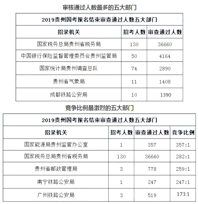 截止到10月31日18时,通过审核人数前三位的部门依次是:国家税务总局贵州省税务局、中国银行保险监督管理委员会贵州监管局、国家统计局贵州调查总队,三部门通过审核总人数达43714人,占通过审核总人数的87.12%。