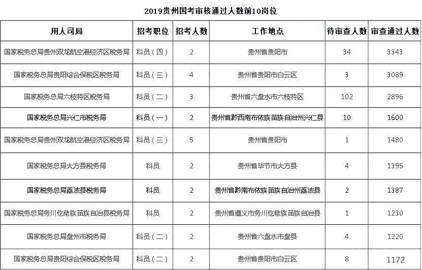 报名首日通过审核人数前十的职位基本集中在国家税务总局贵州省税务局,具体信息如下: