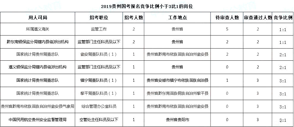 截止到10月31日18时,工作地点在贵州的职位没有无人报考,为了让考生们了解报考比例比较低的岗位,我们为考生们整理了报考比例低于3比1的岗位,供考生们查看!