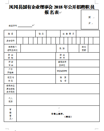 (4)报名方式:现场报名。报名需填写《凤冈县国企理事会2018年公开招聘职员报名表》。