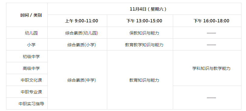 11月4日(星期六)。贵州省2017年下半年中小学教师资格考试笔试所有类别、科目均采用纸笔考试方式进行,每场考试时间为120分钟。