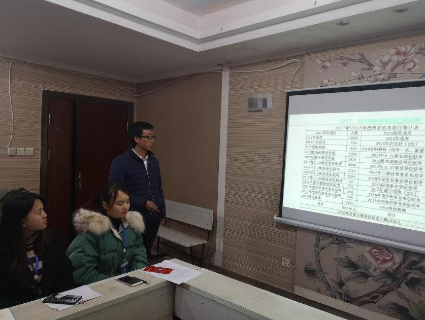 大吴老师为大家盘点了2014年至2018年贵州公务员、事业单位、贵阳教师招考等重要项目的招考情况及他在2018年个人的招生情况。吴老师作为网络招生的主力军,为公司的运营了不少价值,而在做招生咨询的时候,吴老师耐心细致为学员解答各种问题,不少学员也是通过吴老师的咨询解答认可我们新文泰教育。